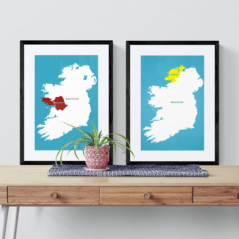 Following on from the success of Cork Not Cork and being a Jackeen himself, Patrick felt compelled to even up the scales with a Dublin-focused design. Hence Dublin Whatever was born, capturing perfectly the innate air of superiority so effortlessy exuded from those who hail from The Pale! Visitors to the Kinsale gallery began to request their own county versions so we created the full series of 32 prints, each one using specific county colours for extra personalisation.